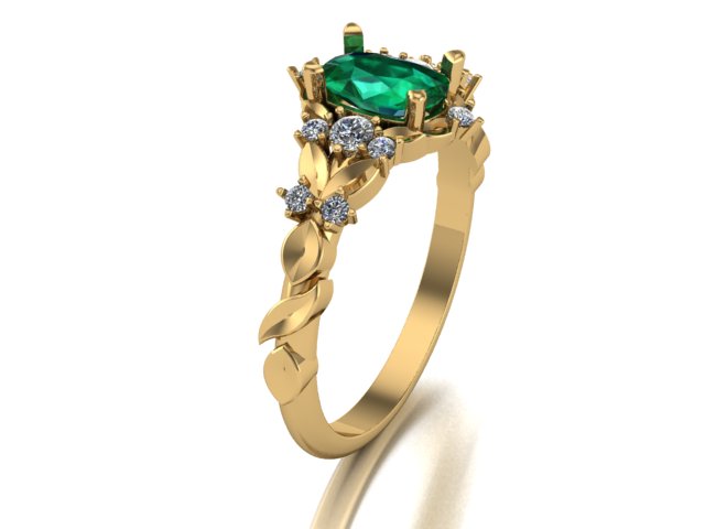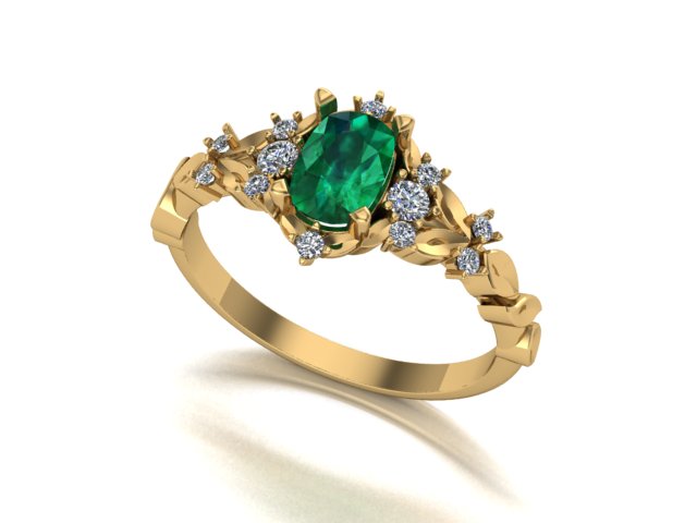 Kamienie: centralny szmaragd laboratoryjny 0,70ct; boczne diamenty laboratoryjne łącznie 0,12ct 12szt.